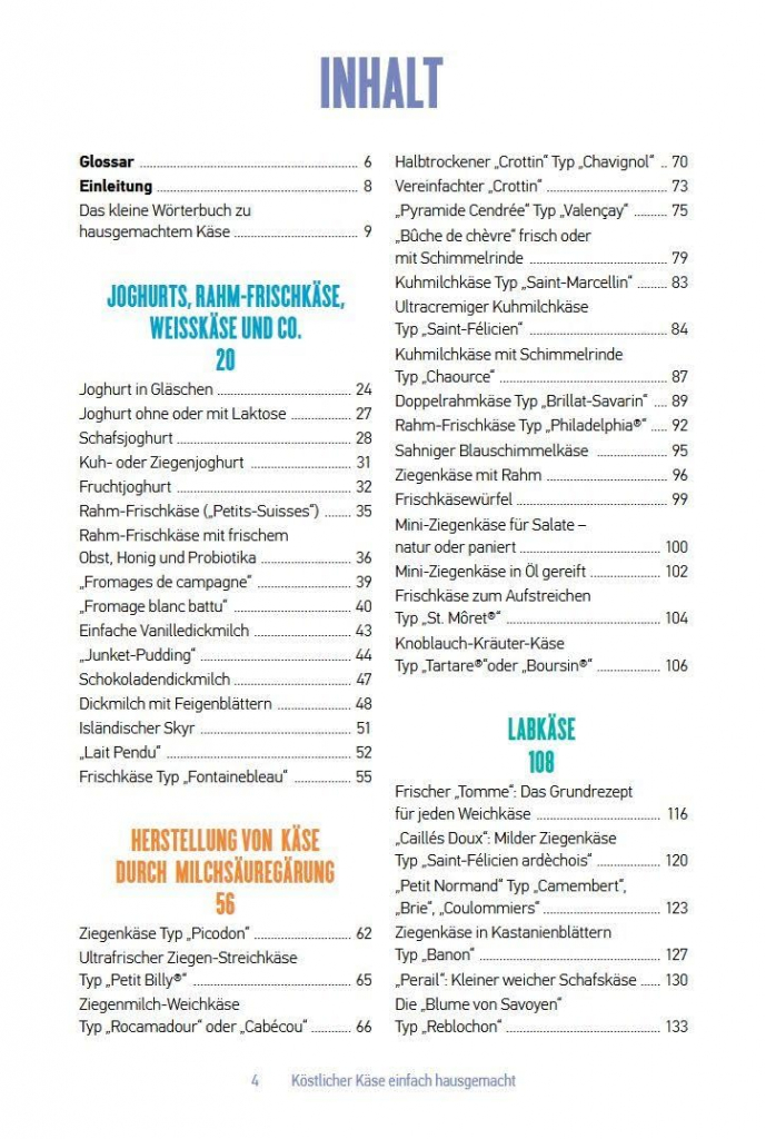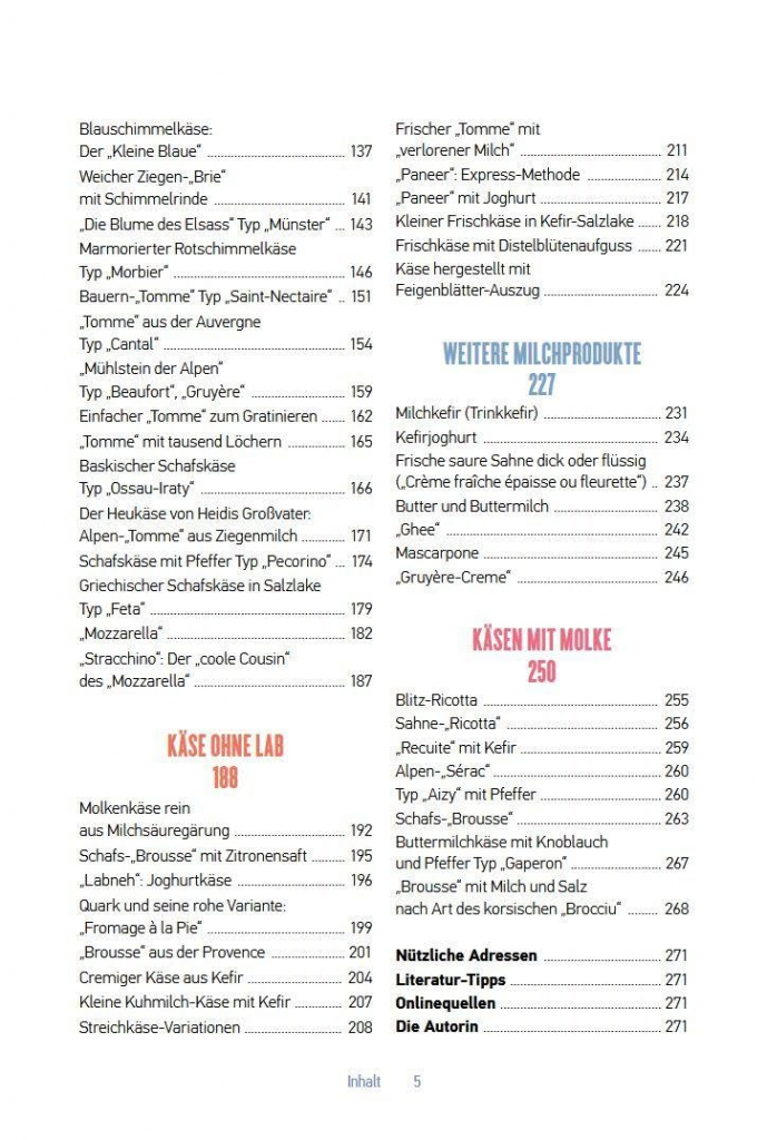 Das aus dem Französischen übersetzte Buch widmet sich in erster Linie den verschiedenen Frisch- und Weichkäsen, die auch zu Hause ohne den großen Aufwand hergestellt werden können, den die fachgerechte Erzeugung von Hartkäse erfordert. Frankreich gilt als das „Käseland“ schlechthin, dementsprechend vielfältig sind auch die in diesem Buch vorgestellten, einfach selbst zu machenden Käsesorten, ob es sich um Brie und Camembert, Doppelrahmkäse wie „Brillat-Savarin“, marmorierten Käse mit gewaschener Rinde in der Art von „Morbier“, korsischen Molkekäse oder verschiedene Blauschimmelkäse handelt. Aber auch Spezialitäten aus Italien und anderen europäischen Ländern, wie in Öl gereifte Frischkäsewürfel, Feta und Mozzarella, Mascarpone und Ricotta, baskischer Schafskäse, Almkäse in Kastanienblättern, Ziegenkäse à la Pecorino-Art finden sich in diesem Buch. Noch einfacher ist die Erzeugung unterschiedlicher Joghurts aus Kuh-, Schaf- oder Ziegenmilch, Kefir und isländischem Skyr, Quark (Topfen) oder Rahmfrischkäse in der Art von Philadelphia.