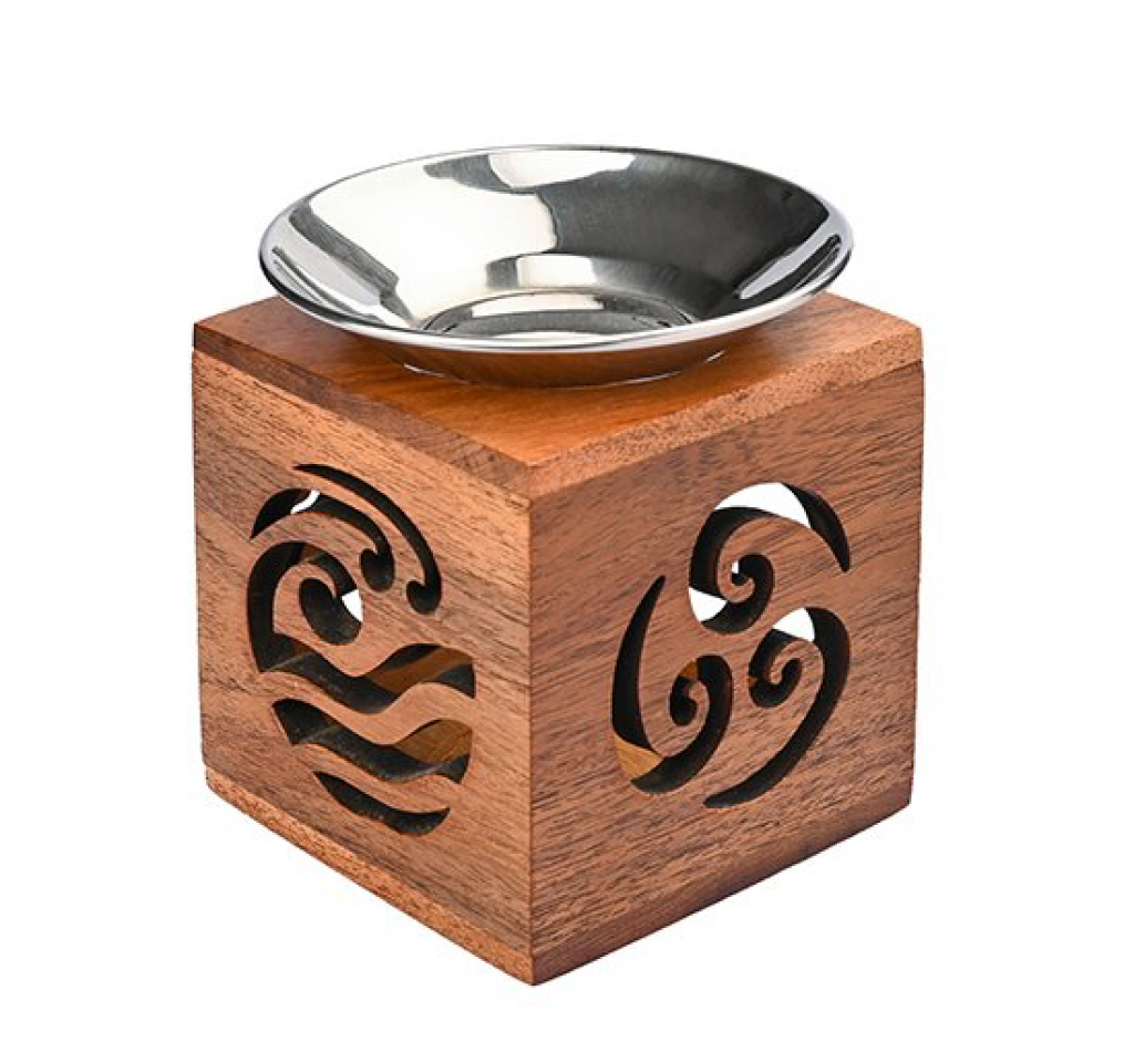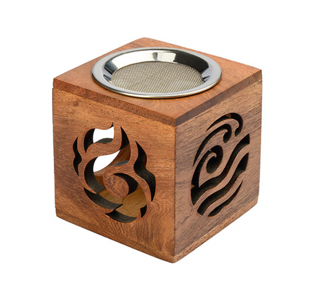 Schöne Aromalampe aus Akazienholz mit den 3 Elementen Feuer, Erde und Luft an den Seiten. Auf der 4. Seite ist eine runde Öffnung für das Teelicht.
