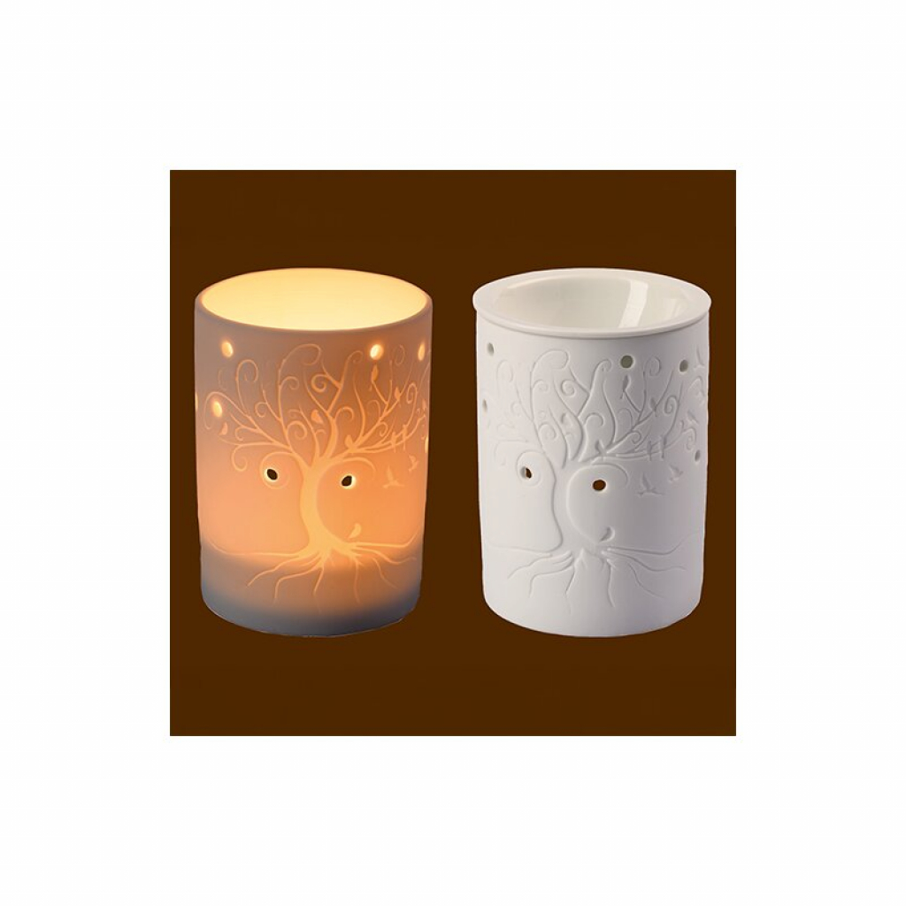 Feine Duftlampe aus weißem Porzellan mit eingearbeitetem durchscheinendem Lebensbaummotiv und abnehmbarer Schale. Kann wahlweise auch als Windlicht oder, mit passendem Sieb (nicht im Lieferumfang enthalten), als Räucherstövchen benutzt werden.
