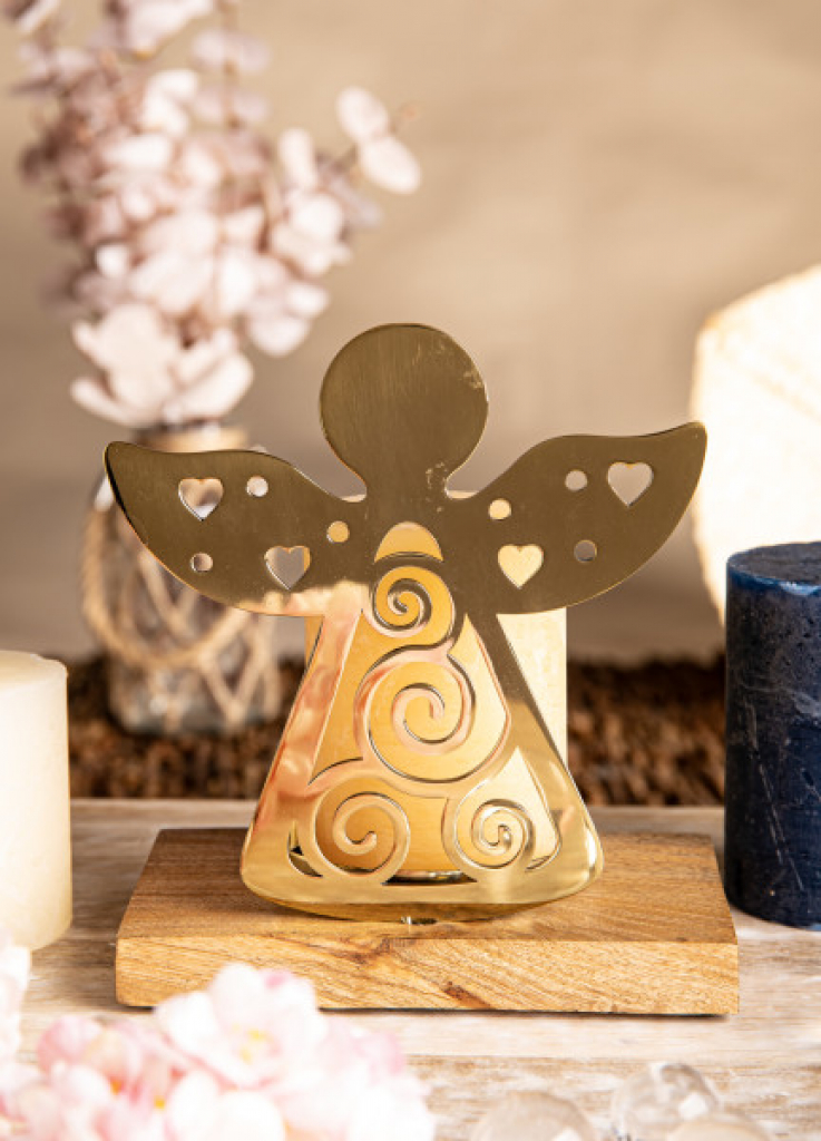 Schön gearbeiteter Engel mit integriertem Kerzenhalter aus goldfarben-plattiertem Edelstahl auf einem Holzsockel aus Mangoholz.