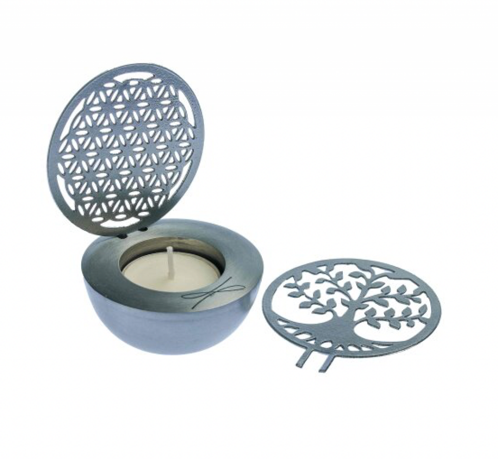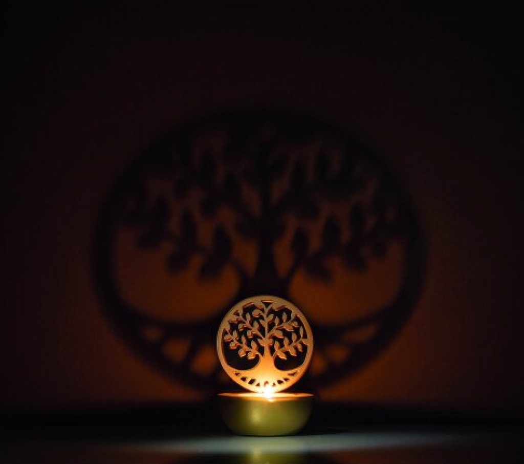 Ein einfaches Teelicht macht es möglich und wirft entweder den Schatten des Lebensbaumes oder den Schatten der Blume des Lebens an die dahinter liegende Wand.