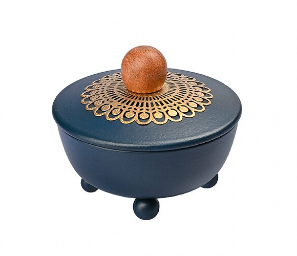 Räuchergefäß aus Eisen in nachtblau, mit einer fein gearbeiteten goldfarbenen Dekorplatte.