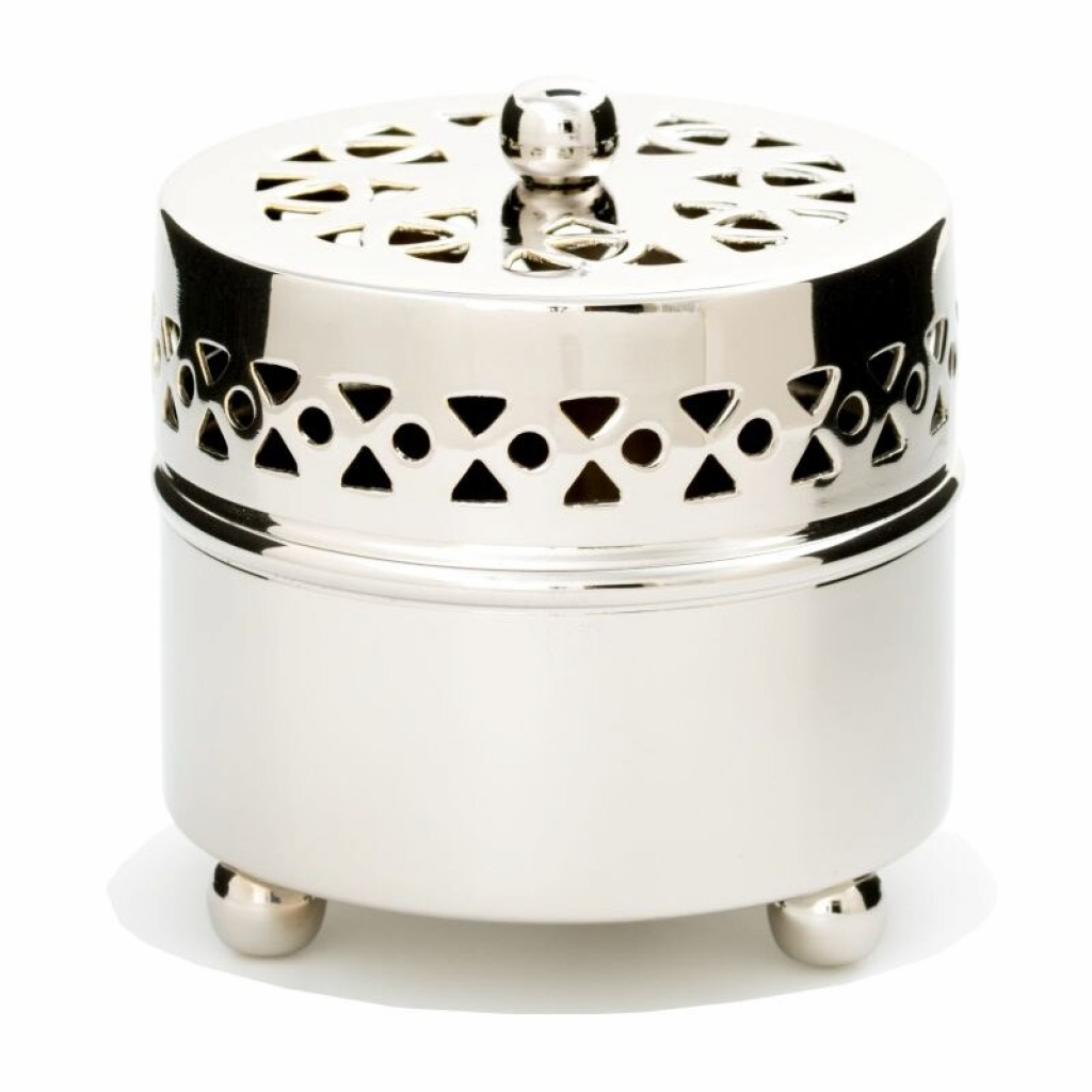 Tischrauchfass in moderner Form mit abnehmbarem Deckel, aus Messing vernickelt und poliert.