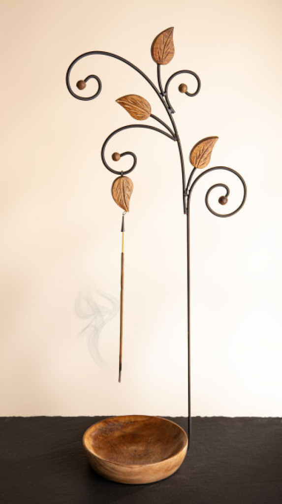 Zauberhafter Stäbchenhalter aus Mangoholz mit einem filigranen Metallgestänge. Das Räucherstäbchen wird kopfüber in eine kleine Metallspirale gesteckt und erzeugt so einen mystischen Nebeleffekt.