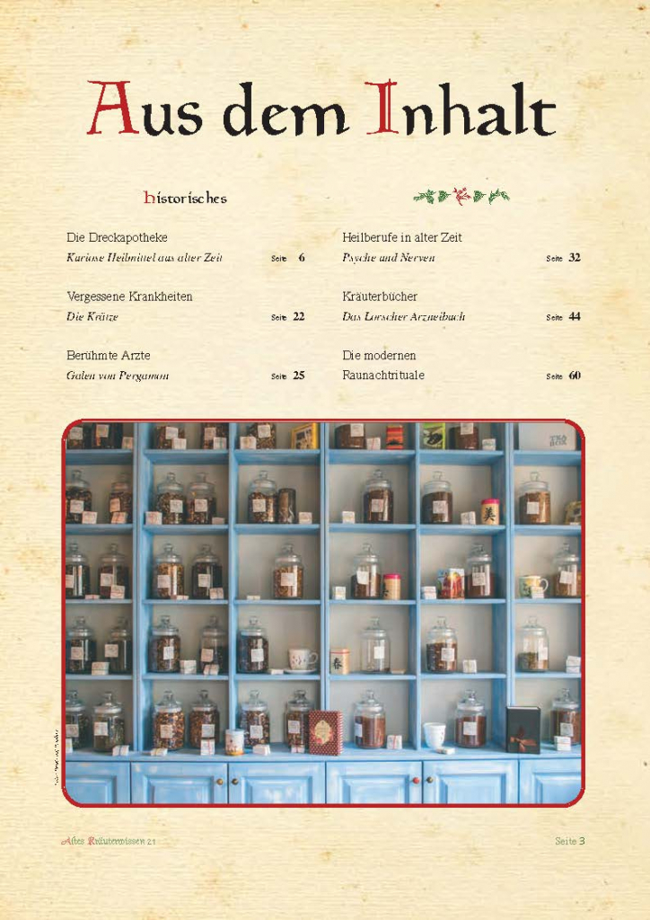Außerdem: • Heilberufe in alter Zeit: Psyche und Nerven • Kräuterbücher: Das Lorscher Arzneibuch • Vergessene Krankheiten: Krätze • Berühmte Ärzte: Galen von Pergamon • Im Portrait: Echtes Labkraut • Kardamom und Koriander: Nicht nur fürs Weihnachtsgebäck • Basilikumsamen: Etwas Neues auf dem Speiseplan regt immer unsere Sinne an! • Neujahr: Wie Menschen anderer Kulturen den Neubeginn feiern • Die modernen Raunacht-Rituale • Lesefutter, Spieltipps u.v.m.